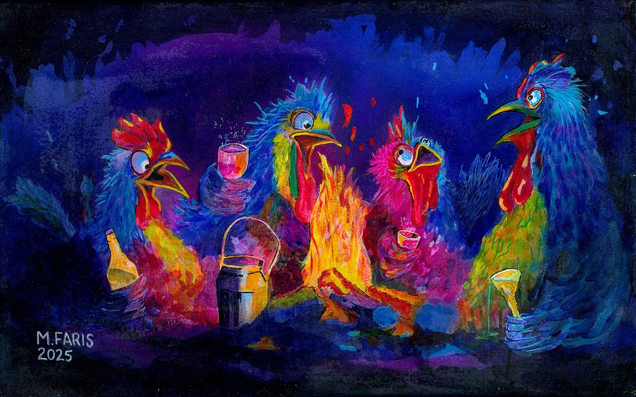 Original Acrylic Paintingsby Michael Faris Fowl Bar Four Mongrels Cats Cathedral Cats Bar Just a Thought The Contractor Five Felines Campfire Cackles Campfire Cackles Ape Roulette Raccoon Riders What Cat Oregon Hobos Kickin’ Back Dancin’ in the Rain Rain Jazz Man Lunch Break Scotch ‘n’ Doobie Cajun Frogs Cocktails Van’s Dream Frazetta Flying Turtle Sunset Quartet Frog Lennon Red Dawn Hot Town Frog Dancers All Frog All String Band Mellow Cello Froggy and Clyde Sundance French Sunrise Struthio Octomusician How to Do Stuff Baboon Scream Baboon My Creative Process How I Build my Canvas