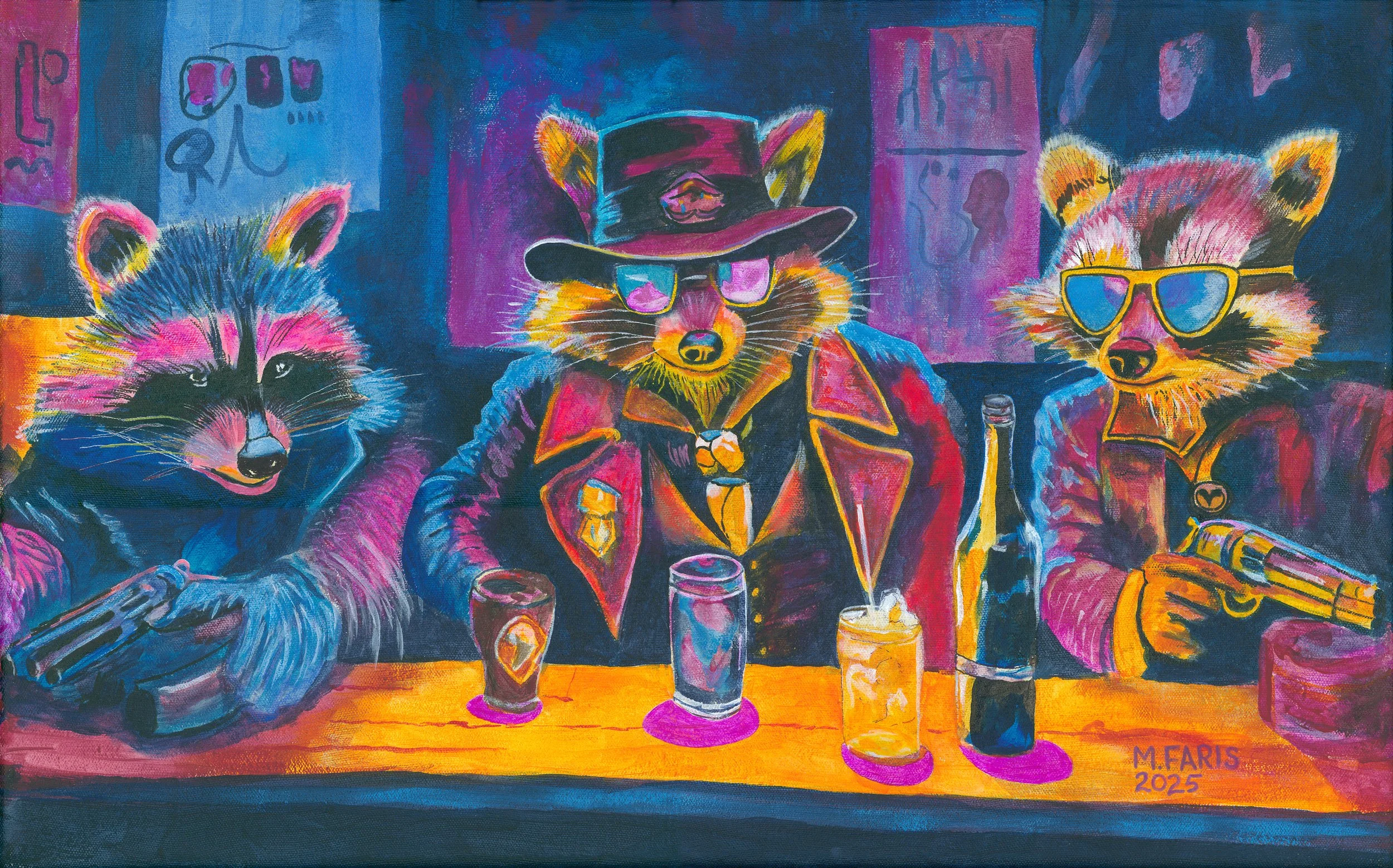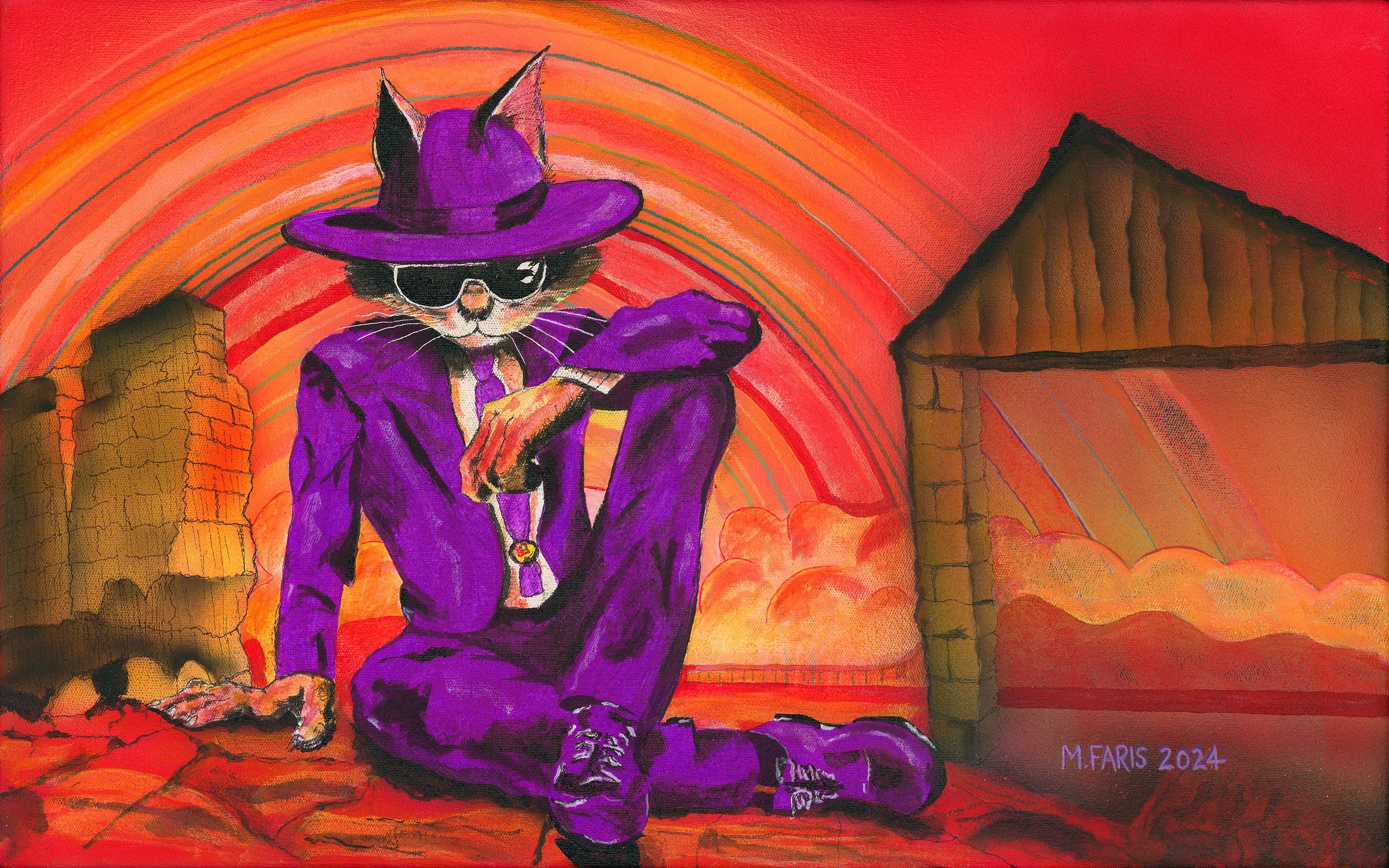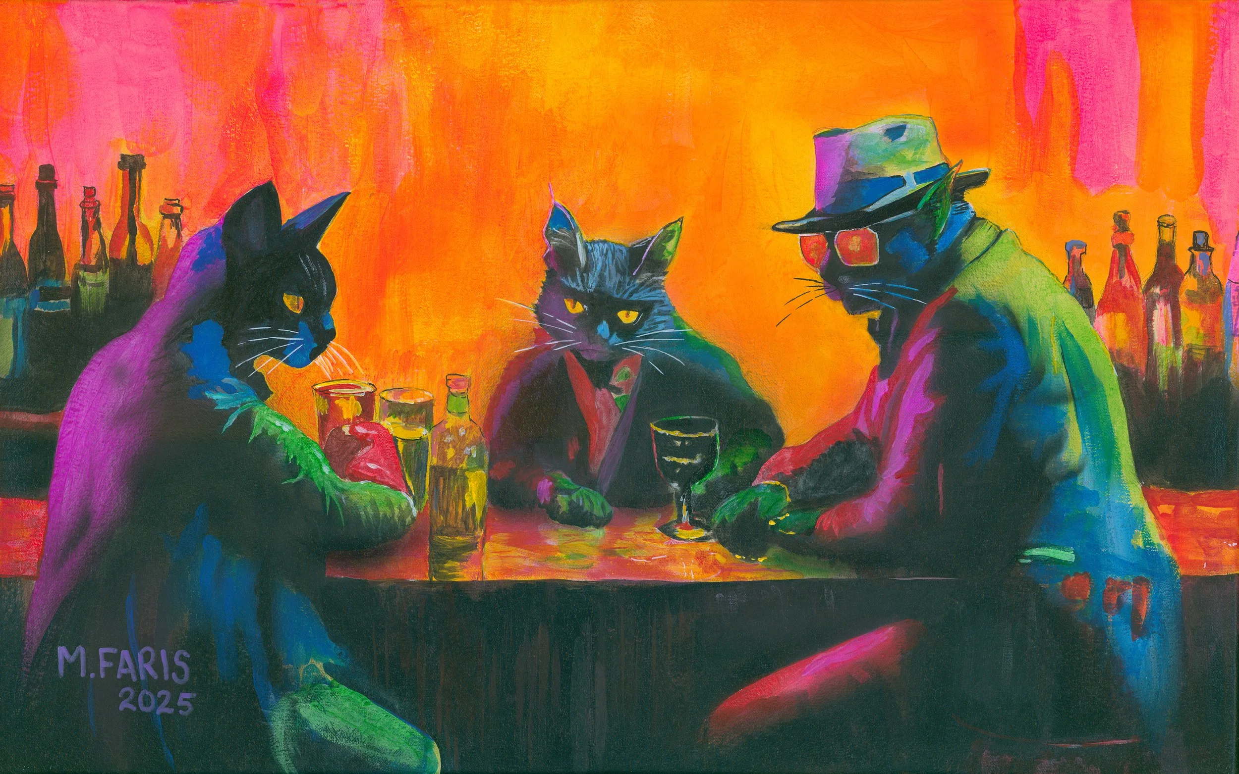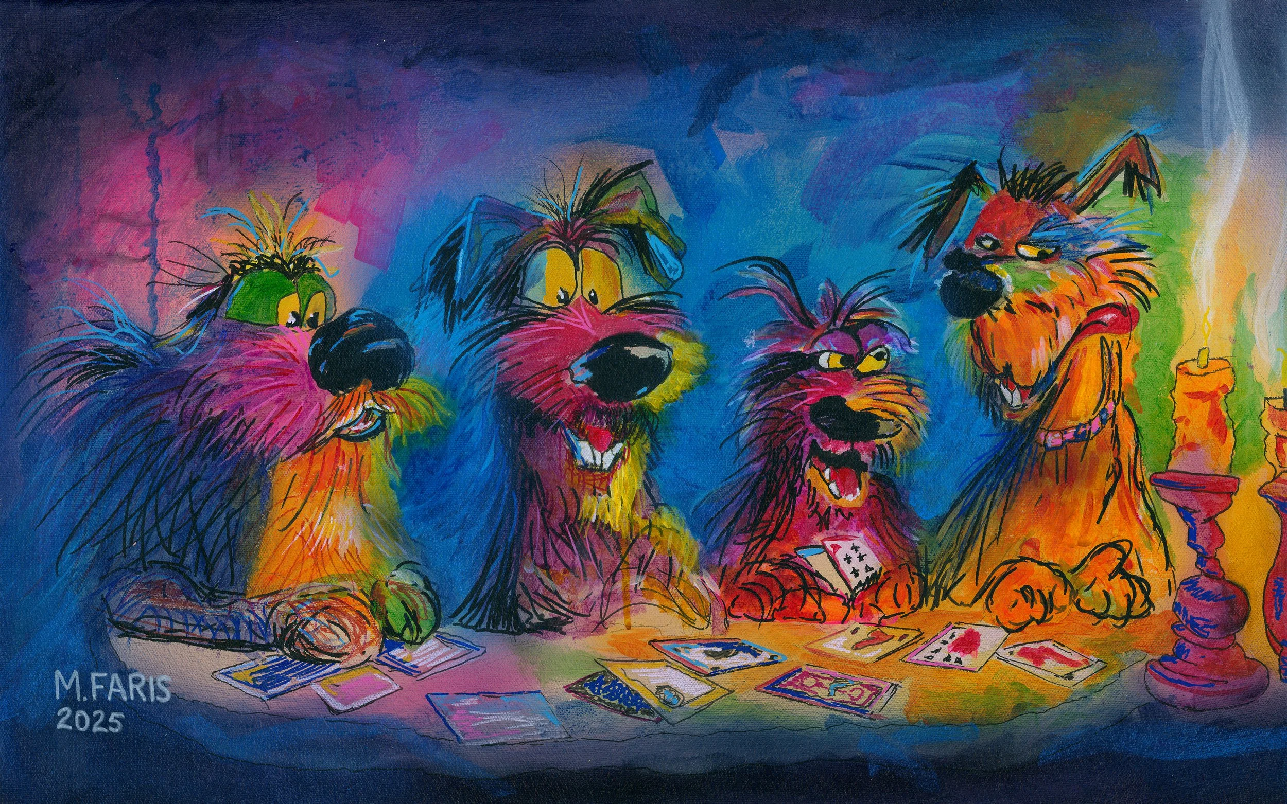 Original Acrylic Paintingsby Michael Faris Four Mongrels Cats Cathedral Cats Bar Just a Thought The Contractor Five Felines What Cat Oregon Hobos Kickin’ Back Dancin’ in the Rain Rain Jazz Man Lunch Break Scotch ‘n’ Doobie Cajun Frogs Cocktails Van’s Dream Frazetta Flying Turtle Sunset Quartet Frog Lennon Red Dawn Hot Town Frog Dancers All Frog All String Band Mellow Cello Froggy and Clyde Sundance French Sunrise Baboon Baboon Scream Octomusician How to Do Stuff My Creative Process How I Build my Canvas