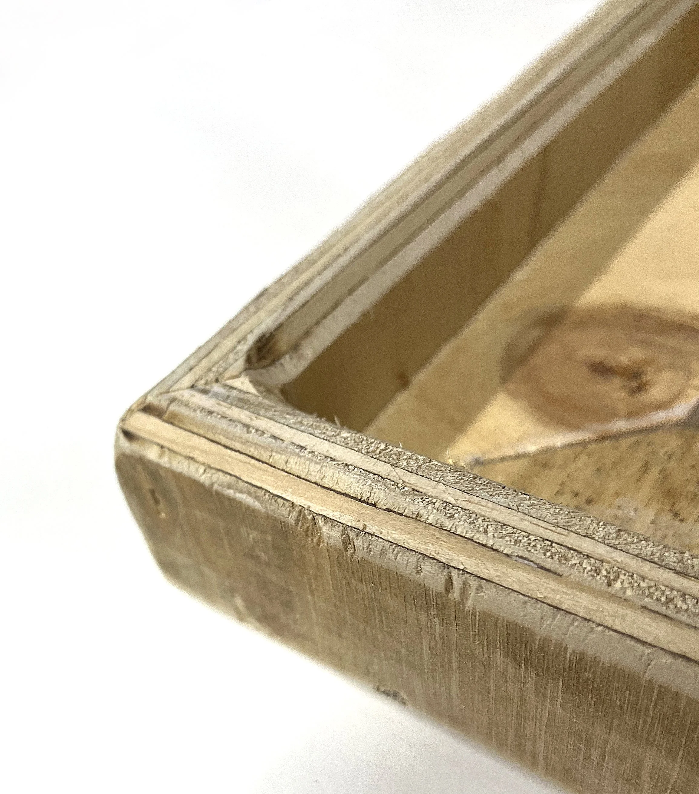 I chose a good shop grade 3/4” plywood for the rails. By cutting it into strips 1.75” wide and gluing 2 pieces perpendicular, the resultant piece becomes a rigid support beam. These can be made to length as needed and the ends mitered to make the desired rectangle. Use PVA glue and staple or pin nails to assemble into a frame. Reinforce the inside corners with scraps of anything thin, such as cardboard or bookboard or mdf. It is important with this design to chamfer or round the edges of the plywood for minimal contact where the canvas wraps around to the sides.
